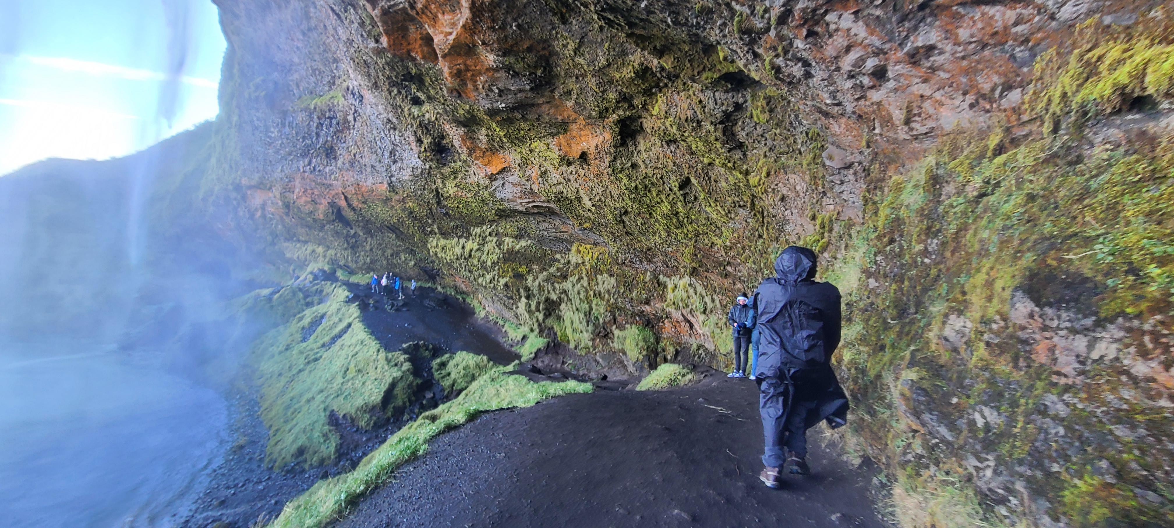 Seljalandsfoss waterfall along Iceland’s southern coast is fed by melting water from the famed glacier- capped Eyjafjallajokull volcano. This powerful waterfall cascades into a pretty meadow. However, the path that runs behind the curtain of water is the main attraction. There you can enjoy a truly unique viewpoint of the waterfall.